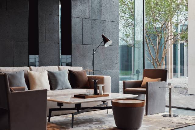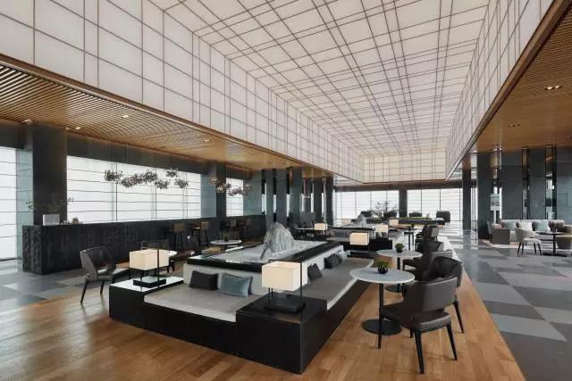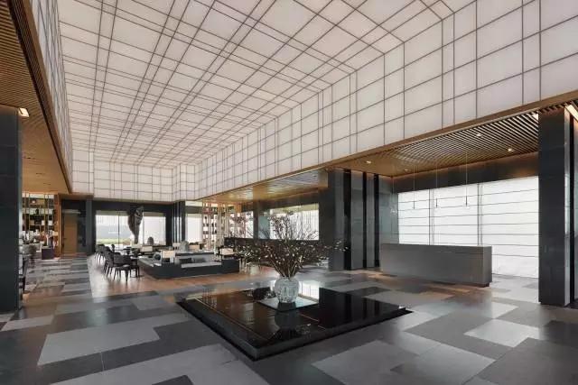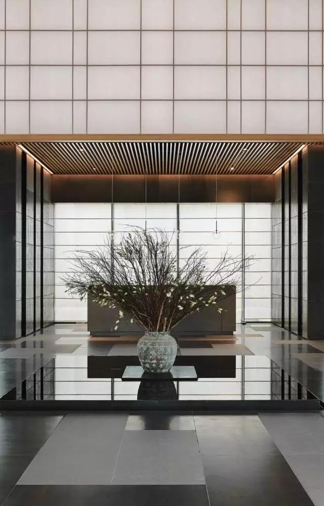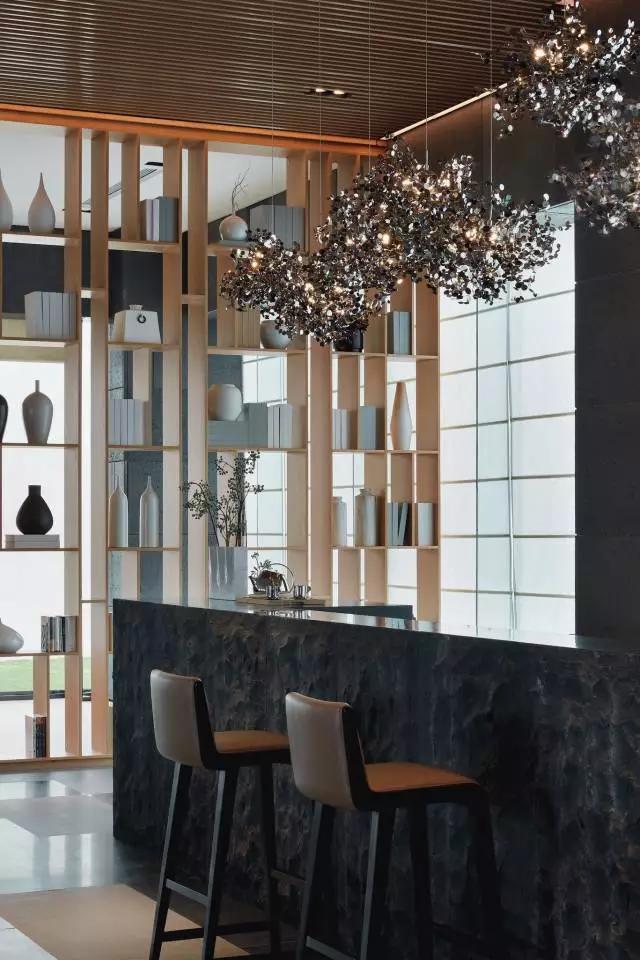 借由東方園林式的假山,打造出“未若柳絮因風(fēng)起”的雪景,美如水墨畫、細(xì)膩至極。這與圍繞式洽談方式布置相結(jié)合,巧妙處理好空間形態(tài)和陳設(shè)之間的關(guān)系。大尺度挑高設(shè)計,加上頂部有序交互的線條,讓空間極具延展性,通透敞亮的照明效果搭配藝術(shù)性燈光點(diǎn)綴,使整體氛圍更顯大氣與品位。該空間通過主體、功能位置、通透的序列式的立面關(guān)系,自然分割空間視線,同時又實現(xiàn)了將光線引入到室內(nèi)的最大化。
