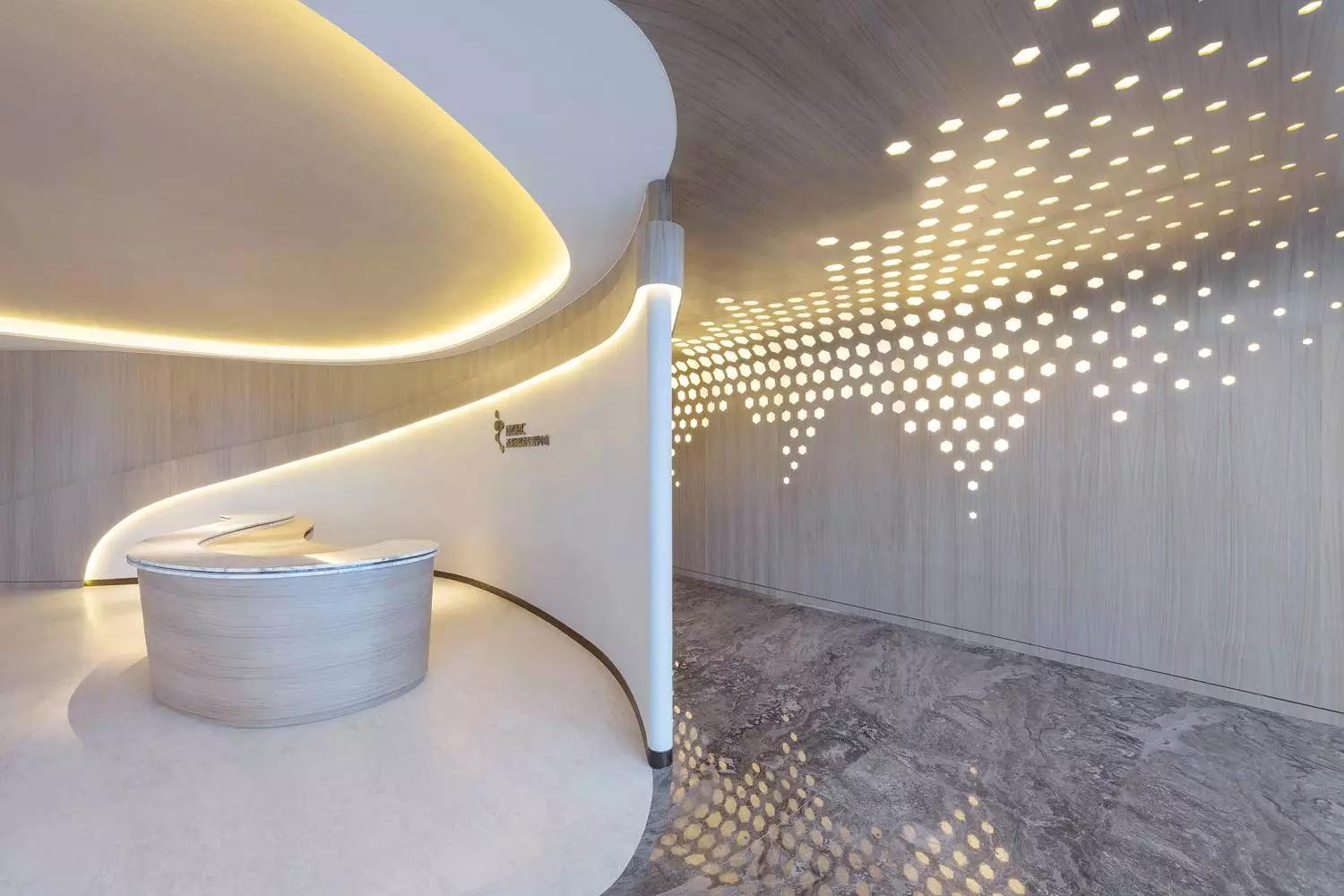 這一切該歸功于大自然的靈感,醫(yī)療中心的正門萃取最純?nèi)坏哪静?,配合溫暖的燈光分布,隨著流線形的空間引導(dǎo)訪客步進全開放的接待處。