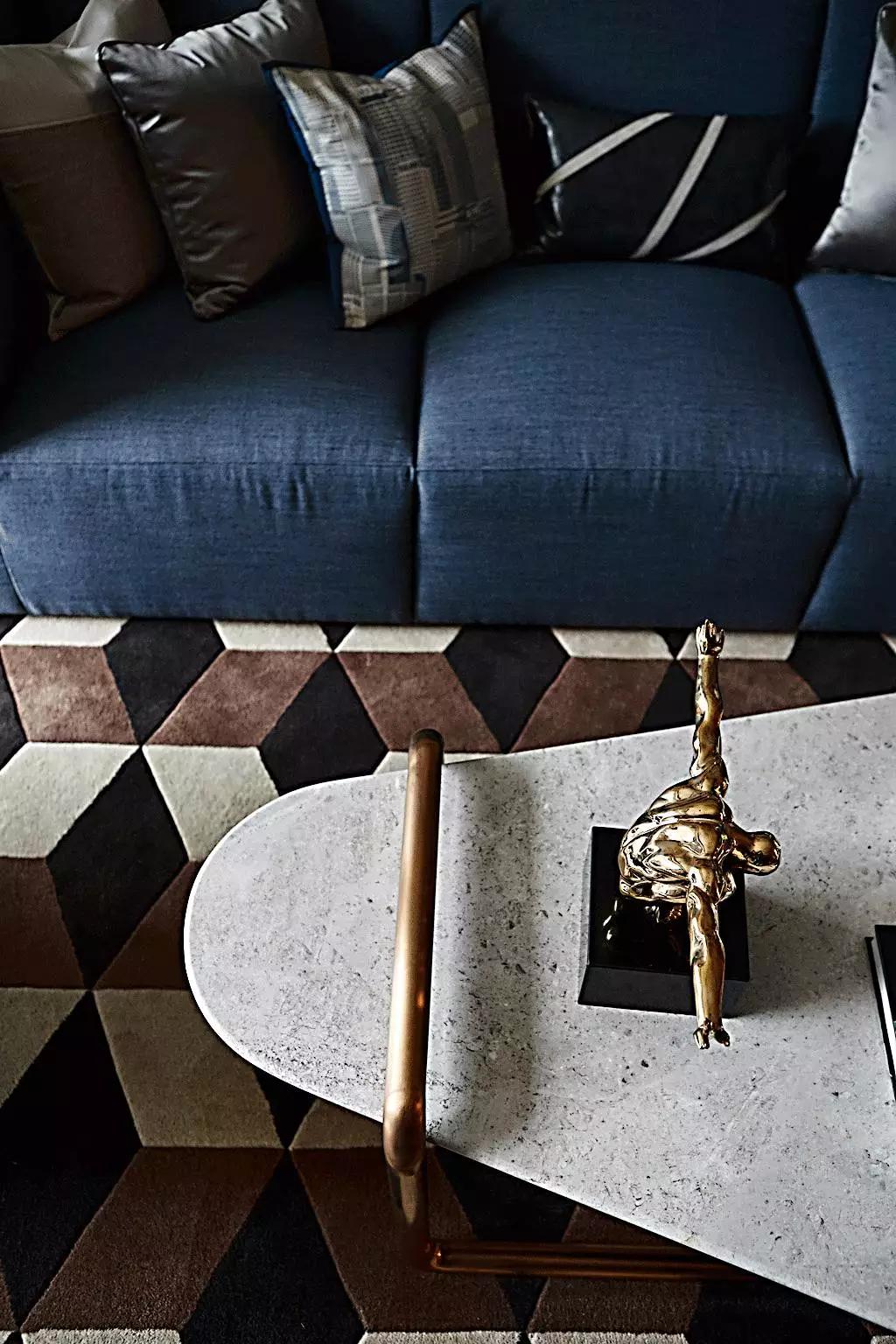 在高級(jí)灰的主調(diào)下,任憑灰藍(lán)、灰咖、米灰自由穿梭。金屬與大理石外表下的冷酷質(zhì)感、紡織布藝的溫柔親膚與皮革制品帶有的手工溫度,交纏錯(cuò)綜,剛?cè)嵯酀?jì)。定制壁爐與優(yōu)雅的Minotti沙發(fā),隱約顯露出居所主人優(yōu)越的品味。