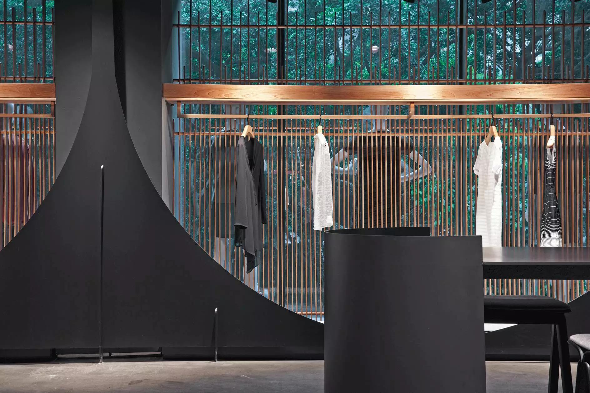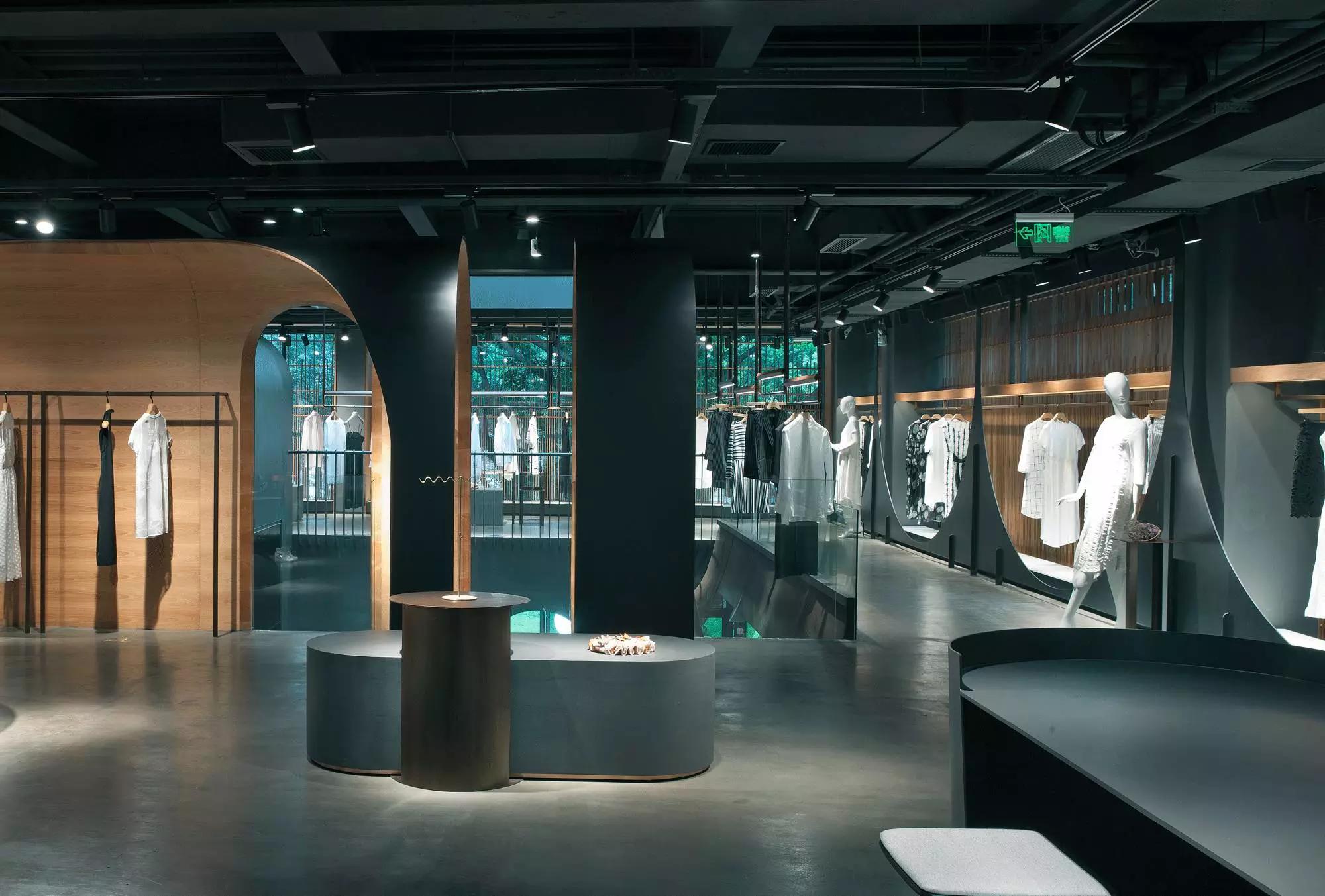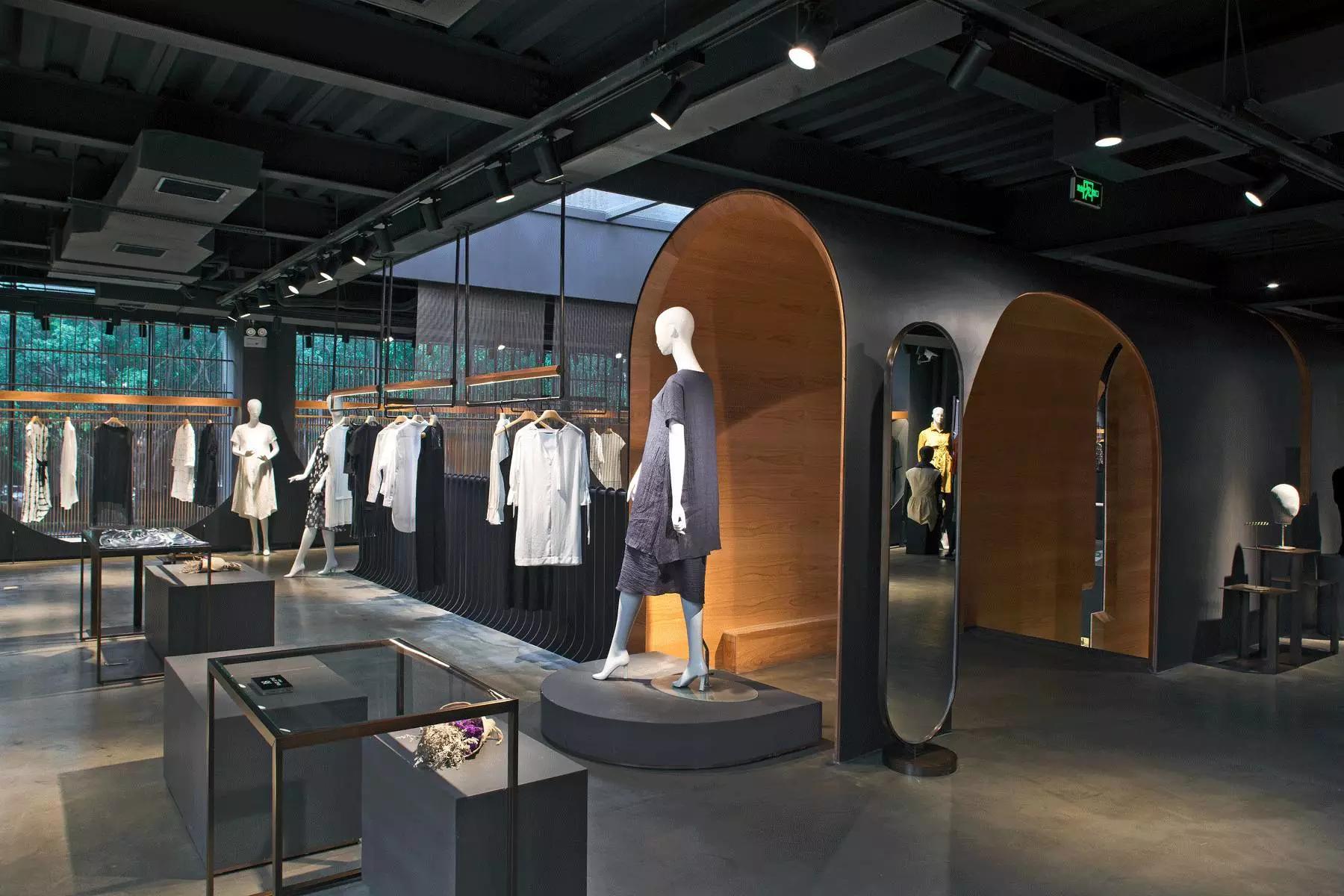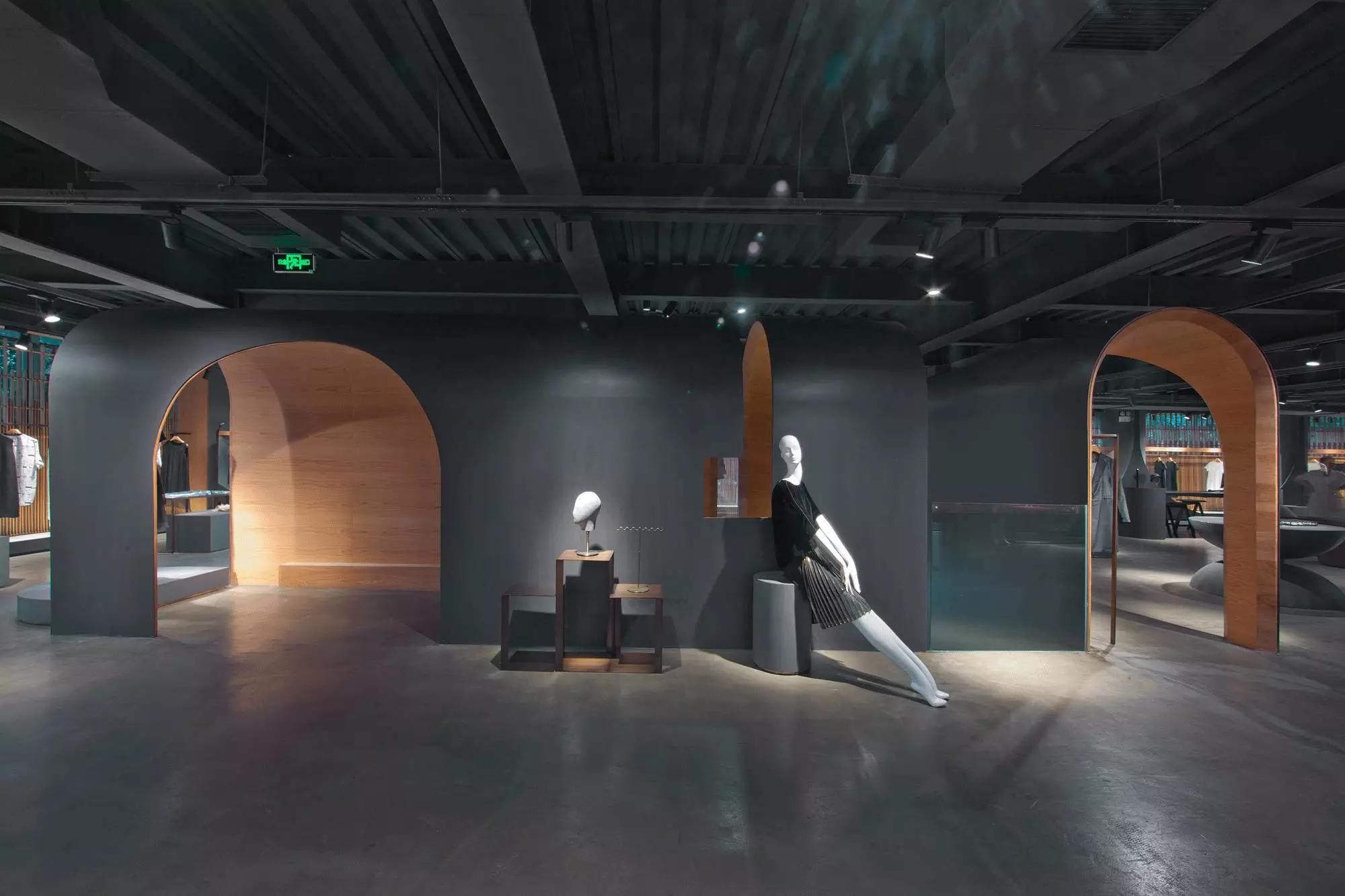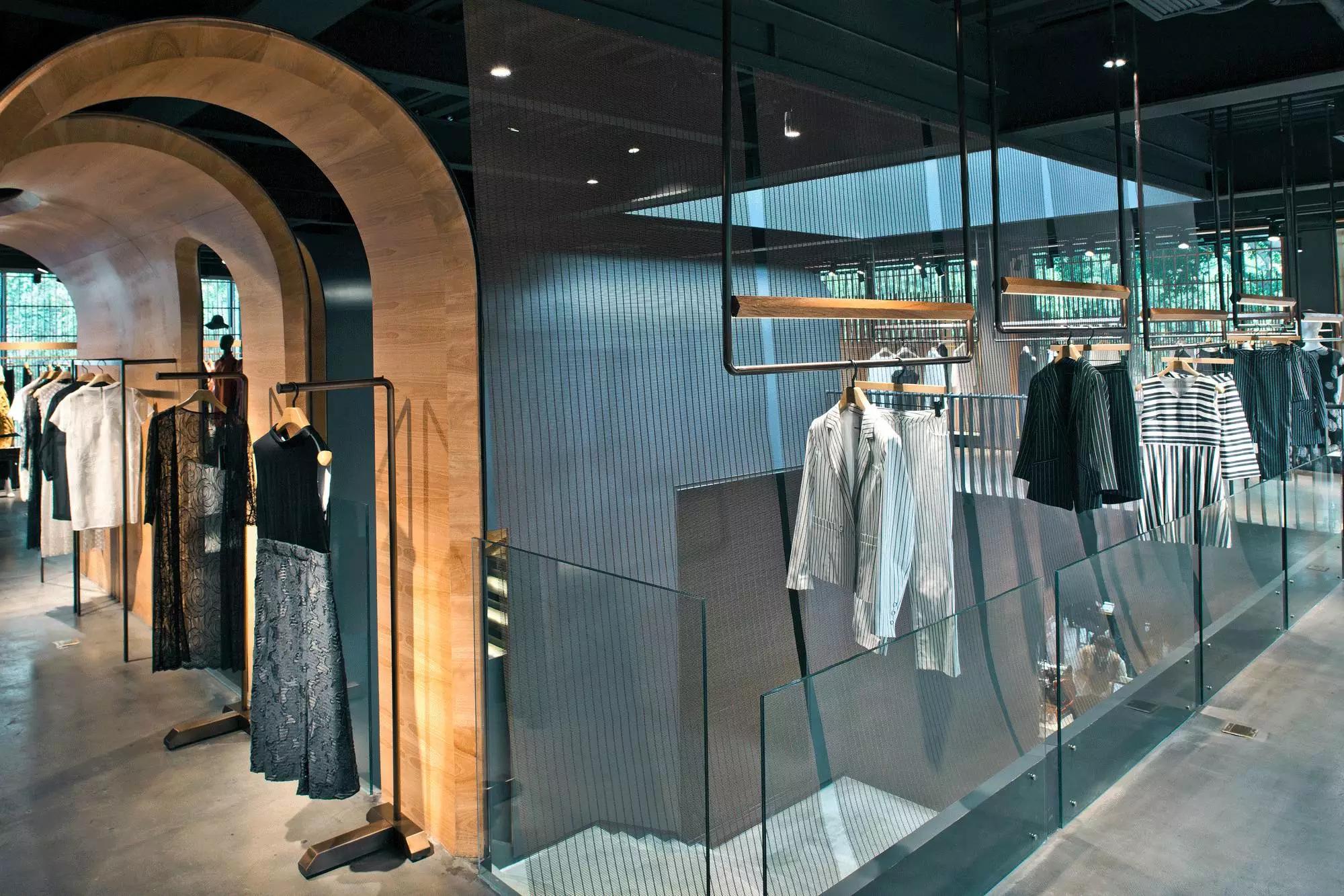 和一般常規(guī)服裝店陳列的概念不同,新的店鋪概念強(qiáng)調(diào)建筑化的零售模式。纖細(xì)的木屏風(fēng)結(jié)合貨架矗立在邊界處,渲染了空間和室內(nèi)飾面的豐富多樣性,建筑元素顯露材質(zhì)原始的質(zhì)感,烘托服裝的品質(zhì),這種手法為整個(gè)店鋪灌注純粹的氣氛,隱喻品牌的精神。天井樓梯釋放出不同光影效果,使整個(gè)空間與建筑取得一種時(shí)間與空間的對(duì)話。設(shè)計(jì)中,我們直白的將不同的“拱”垂直交疊,希望在垂直空間上制造不同的空間與體驗(yàn)。這個(gè)特殊的表現(xiàn)方式給人們提供強(qiáng)烈的視覺(jué)效果。依據(jù)商業(yè)需求,采用模塊式設(shè)計(jì),這樣可以使品牌不同功能具有最大的靈活性。