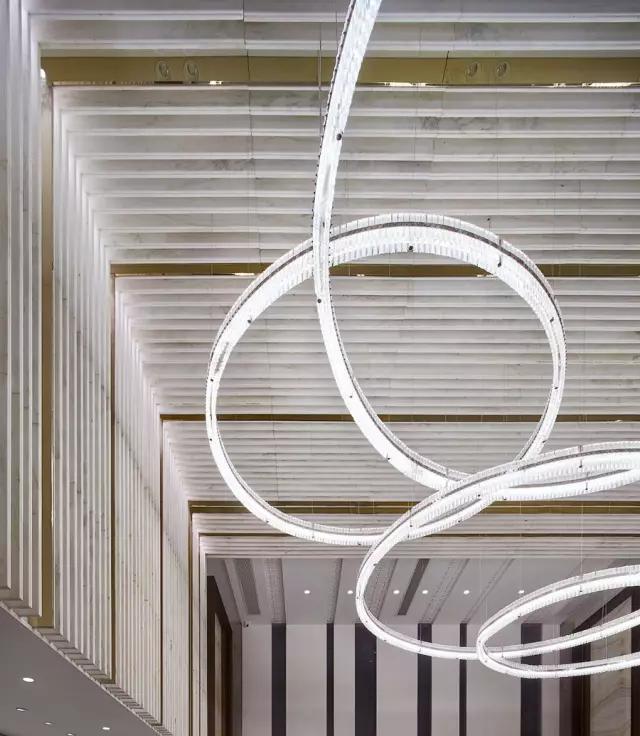 天花和墻體以犀牛白大理石片狀方式陣列,石材與石材之間加入香檳色鏡面不銹鋼做為分隔,巧妙地渲染了空間的尊貴價(jià)值感,也很好地提升了視覺(jué)的立體感。
